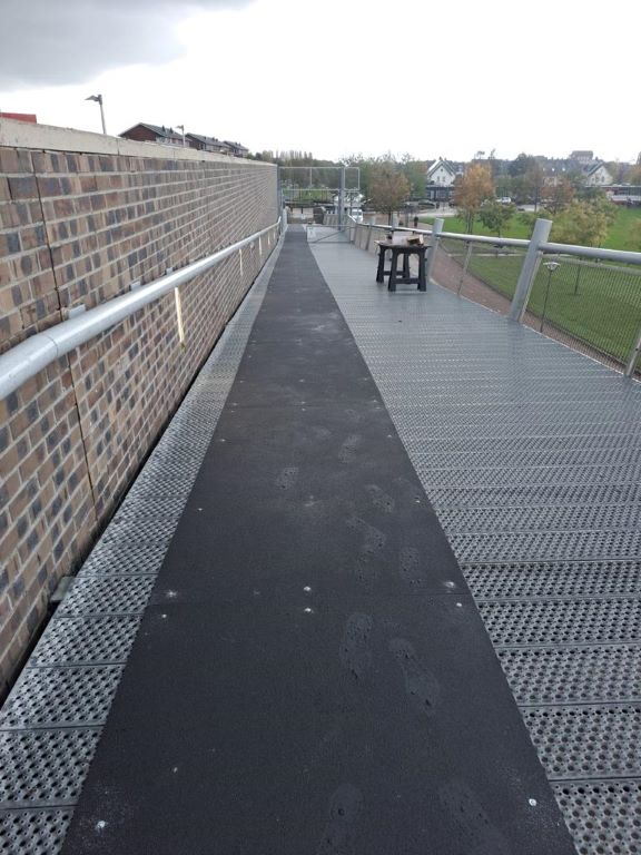 Bei nassem Wetter und im Winter wurden die Gitterroste dieser Fahrzeugrampe rutschig. Da die Rampe auch zu Fuß begangen wird, wollte der Auftraggeber einen Laufweg schaffen, der bei allen Witterungsbedingungen sicher begehbar ist. Mit 4-mm-Platten mit feiner Körnung wurde dieses Problem für die kommenden Jahre gelöst. Die Befestigung erfolgte mit Gitterrostklemmen.